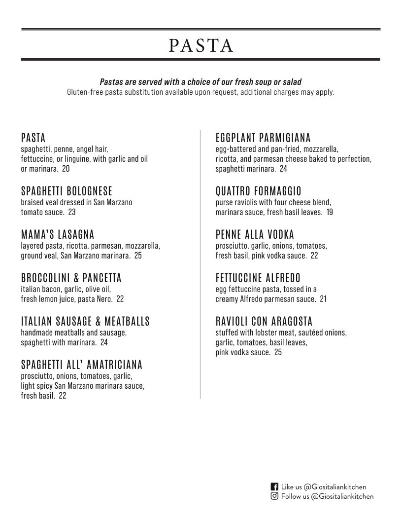 Welcome to Gios Italian Kitchen Myrtle Beach, where authentic Italian flavors come alive! Nestled in the heart of Myrtle Beach, this charming eatery serves up a tantalizing menu that highlights the essence of Italian cuisine. Treat yourself to a variety of pasta dishes, each thoughtfully crafted to bring out rich, robust flavors. From the comforting Ma's Lasagna to the indulgent Ravioli Con Aragosta, every bite delivers a taste of Italy.